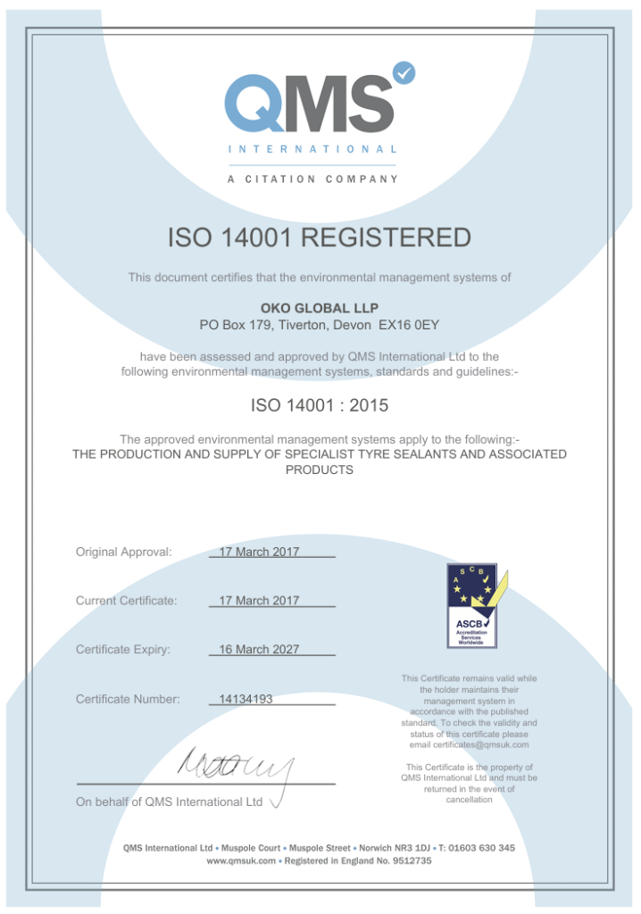 Nos enorgullece ser la marca original (y la única genuina) de sellador de neumáticos preventivo y antipinchazos OKO, fabricado en el Reino Unido. Certificado como «carbono negativo»; ahorramos más CO2 del que generamos en toda nuestra empresa.